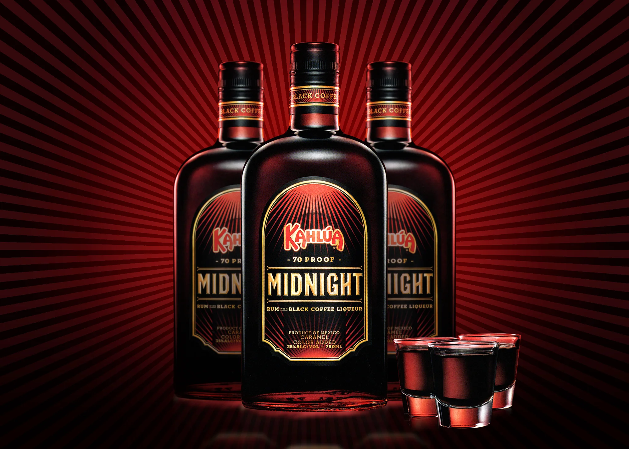 Part of the brief was aimed toward gaining new audiences with new product offerings. Brand Union was tasked with creating a higher alcohol proof/less sugar coffee liqueur to permanently add to the Kahlúa portfolio. Raise your shot glasses for Kahlúa MIDNIGHT™- a 70 proof (35% abv) blend of rum and delicious black coffee liqueur.